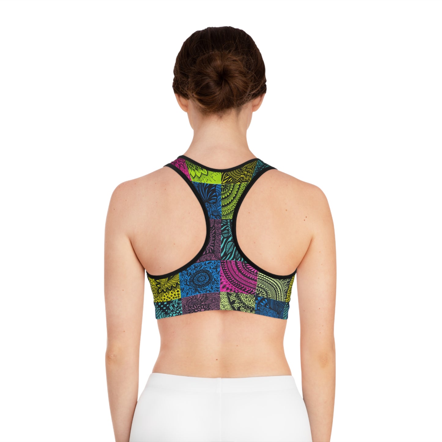 Elevate your workout with the Stretch & Sketch sports bra. This stylish bra features a playful all-over print inspired by post-it note doodles. Designed for both comfort and performance, it offers a supportive compression fit without feeling restrictive. The double-layer front ensures maximum comfort and minimizes bounce. Make a statement at the gym with this perfect blend of style and support